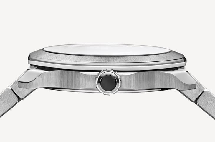 表壳直径41mm、厚度9.15mm,由不锈钢打造,经过拉丝与拋光处理,展现清晰层次,相比Finissimo的锐利线条,Octo Roma的八角轮廓更显温润,表耳和表冠护肩经过重新设计后,结构更为坚固,并具备100米防水性能,搭配短表耳设计,让手表在手腕上的服贴感相当出色,无论正装或休閒都能驾驭。