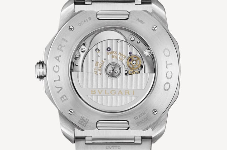 手表内部搭载的BVL 191 Solotempo自动机芯,由宝格丽自家工坊制造,震频4Hz,动力储存42小时,具备时、分、秒与日期功能,虽然是日常佩戴导向的作品,机芯依旧展现了细腻修饰,包括日内瓦波纹与斜角打磨,这份扎实工艺感,让Octo Roma在「实用」之外仍保有高级制表的标准。