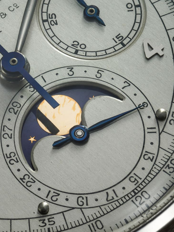 ▲由Stern兄弟制作的面盘保存完好,环形日期刻度与月相细节清晰如新,这种难得的完整状态,不仅映照出百达翡丽的工艺水准,也进一步提升了其收藏魅力。