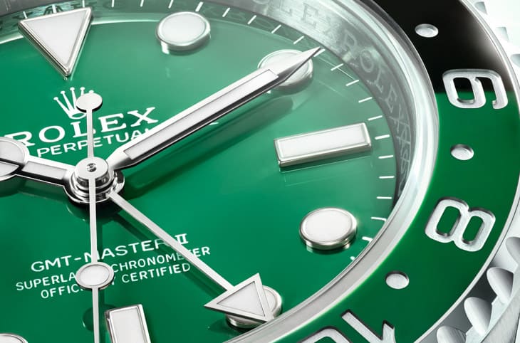 若要论126729VTNR最具突破性的地方,首推它是劳力士史上首款搭载Cerachrom陶瓷面盘的作品。陶瓷对劳力士并非新鲜事,品牌早在2005年就推出陶瓷表圈,至今已累积丰富制作经验,但将陶瓷直接用于面盘,却是首次尝试。这片绿色陶瓷面盘与表圈的绿色部分同源同质,色泽一致且质感细腻,呈现出一种介于宝石与漆面之间的深邃光泽。实物效果比官方图片更低调内敛,甚至让人联想到高尔夫大师赛的绿夹克。制作方式上,它并非使用整块陶瓷,而是将薄片陶瓷固定于黄铜基板,兼顾美感与耐用性,陶瓷防刮、长期保持光洁如新,这对于一款定位为日常佩戴与旅行伴侣的GMT手表来说,实用价值很高。值得注意的是,面盘文字依旧透过传统移印工艺完成,时标则以白金镶嵌并填充蓝色Chromalight夜光,确保夜间清晰读时,种种细节平衡了传统与创新,也避免让新材质显得过于突兀。