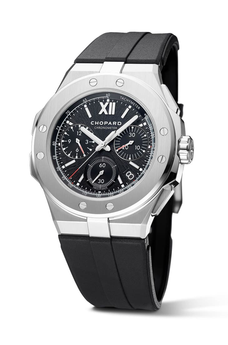 Alpine Eagle系列以雄鹰与阿尔卑斯山为灵感,面盘的虹膜纹理宛如鹰眼注视,是系列出道以来便广为人知的招牌特徵。系列中的人气款XL Chrono以44mm大器尺寸搭配Lucent Steel™精钢表壳,展现力量与优雅的结合,腕表的计时按把隐身于表冠护肩设计,细看会发现螺丝与表圈方向完美对齐,体现讲究周到的工艺理念;面盘上的测速计刻度与小表盘清晰易读,与赛车计时需求紧密连结。透过背面可欣赏到03.05-C导柱轮计时机芯,由三项专利技术提升计时操作的精确与流畅,这款作品无论搭配金属链带或橡胶表带,皆具体展现出现代运动时计的力量感。