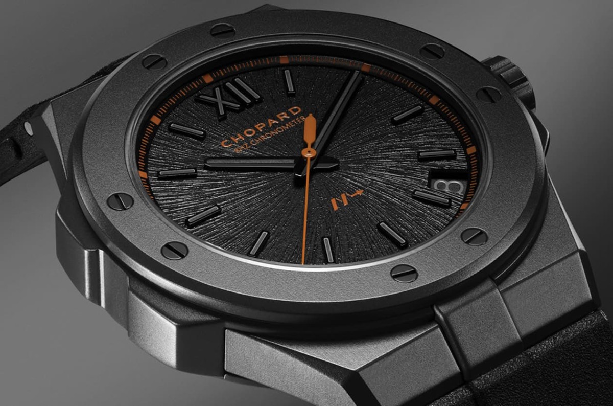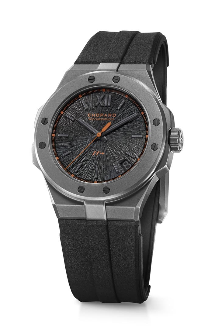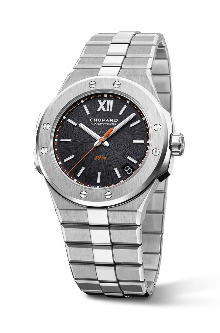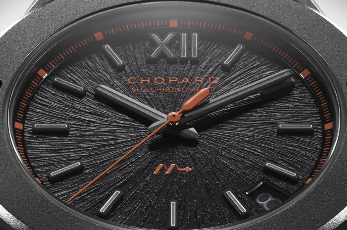 这款以全钛金属打造表壳与一体式链带,透过缎面与拋光交错处理,呈现坚固又精致的运动感。腕表尺寸为41mm、厚度仅9.75mm,无传统表耳设计能达成舒适佩戴性并且对手腕较细的人也是相对友善的设计。纯黑色鹰眼纹理面盘搭配亮眼的橘色细节,包括箭羽秒针、8Hz标志与分钟刻度,使腕表充满速度感与科技氛围。Alpine Eagle Cadence 8HF核心是获得COSC认证的L.U.C 01.12-C高震频机芯,每秒8次震动(57,600次/小时),以更高震频减少误差并提升抗震与抗磁表现,并维持充裕的60小时动力储存,机芯含有硅材质擒纵系统,能降低摩擦与磨耗,确保精准与耐用;儘管机芯修饰相对简约,但性能与技术突破才是这款时计的真正亮点。
