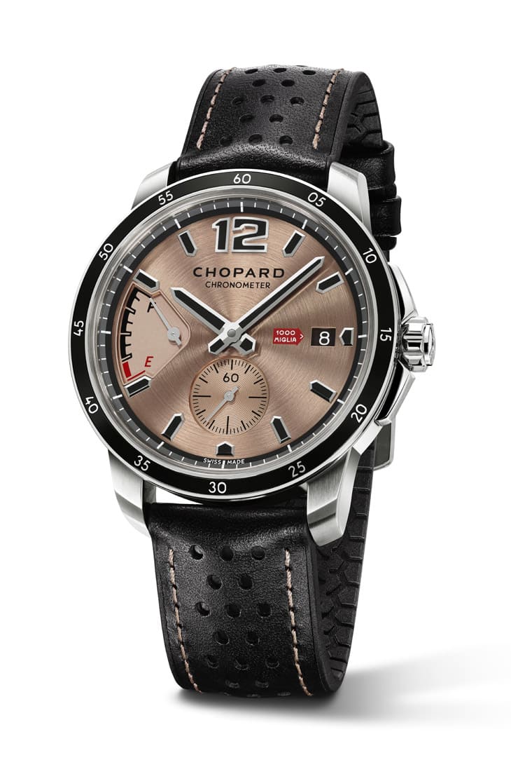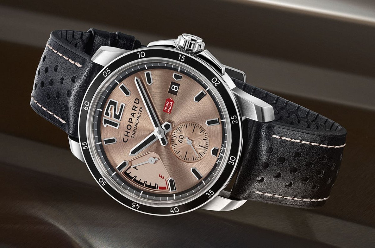 Mille Miglia系列是萧邦对赛车文化的热情回应,2025年这款GTS Power Control以鮭鱼色面盘为亮点,将赛道氛围带入日常佩戴,面盘的红色箭头日期窗与燃油表式动力储存指示器,将车辆仪表的意象化为制表语言。黑色Super-LumiNova夜光涂层则确保夜间清晰读取,兼具功能性与运动感。