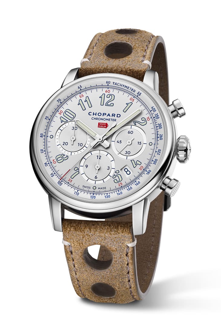 同系列另有一限量致敬作,灵感来自1955年Stirling Moss爵士与Denis Jenkinson于Mille Miglia千里赛中创下不败纪录70周年。银色乳光面盘呼应Mercedes-Benz 300 SLR的「银箭」车色,复古三眼布局与红色计时针相得益彰,表壳设计细节借鑑古董车元素,如活塞状按把、油箱盖式表冠,令人联想到赛事现场。