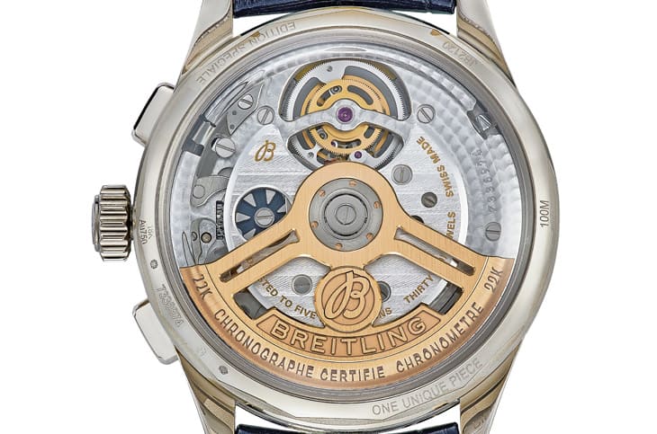三只手表皆搭载百年灵与La Joux-Perret合作开发的B21自动机芯,这枚机芯将陀飞轮与计时功能结合,是制表工艺中的高难度挑战,面盘12点钟方向的陀飞轮不仅带来视觉张力,更能有效抵消重力影响,提升走时精准度。这枚机芯经COSC认证,确保稳定可靠,并具备约55小时动力储存,透过蓝宝石底盖,可以欣赏到18K金镂空自动盘与陀飞轮的细节雕琢。