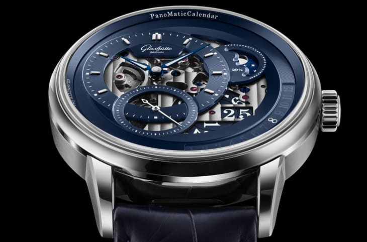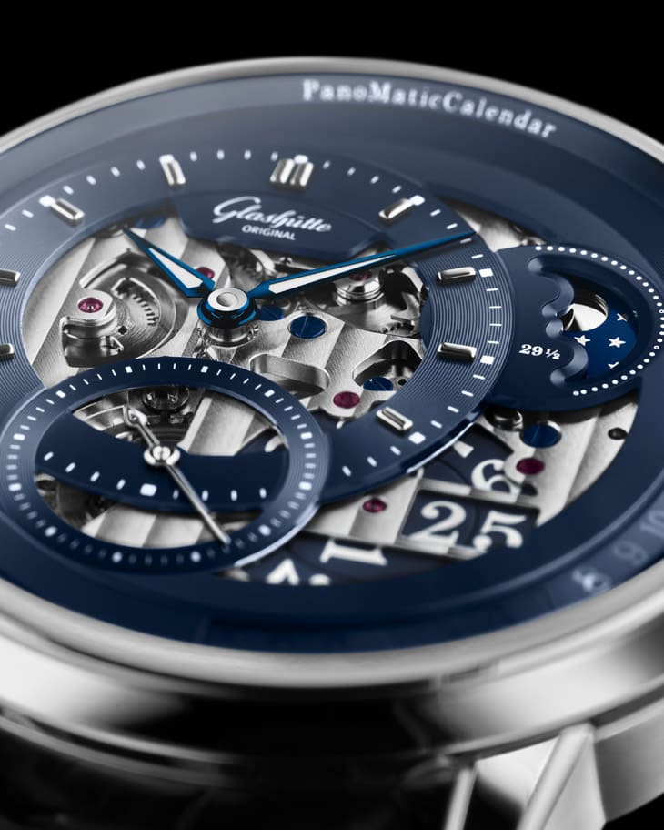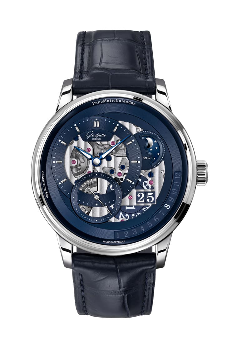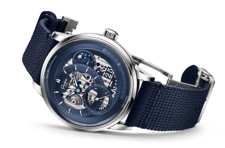 格拉苏蒂原创分别提供了两种表带选择:一是蓝色路易斯安那鱷鱼皮,典雅而正式;另一是蓝色高品质尼龙编织,带来运动与休閒氛围,两者皆搭配铂金摺叠扣,既安全又与整体蓝色美学呼应。