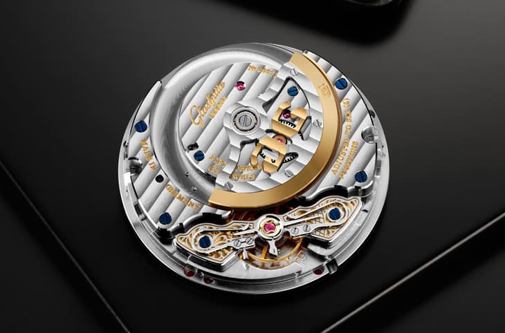 手表内部为92-11自动机芯,它源于92-09机芯,并进一步以镂空设计提升观赏性。机芯每小时震频28,800次,搭配抗磁、耐温差的硅游丝,走时稳定可靠,100小时动力储存足以应付长假或周末不戴的情况,回到手腕上依旧精准。透过正面镂空与蓝宝石底盖,可以欣赏到四分之三夹板上的格拉苏蒂柱状纹、倒角打磨、蓝钢螺丝,还有手工雕刻的摆轮夹板,双鹅颈式微调与金质微调螺丝的存在,更彰显了德国制表严谨的态度。