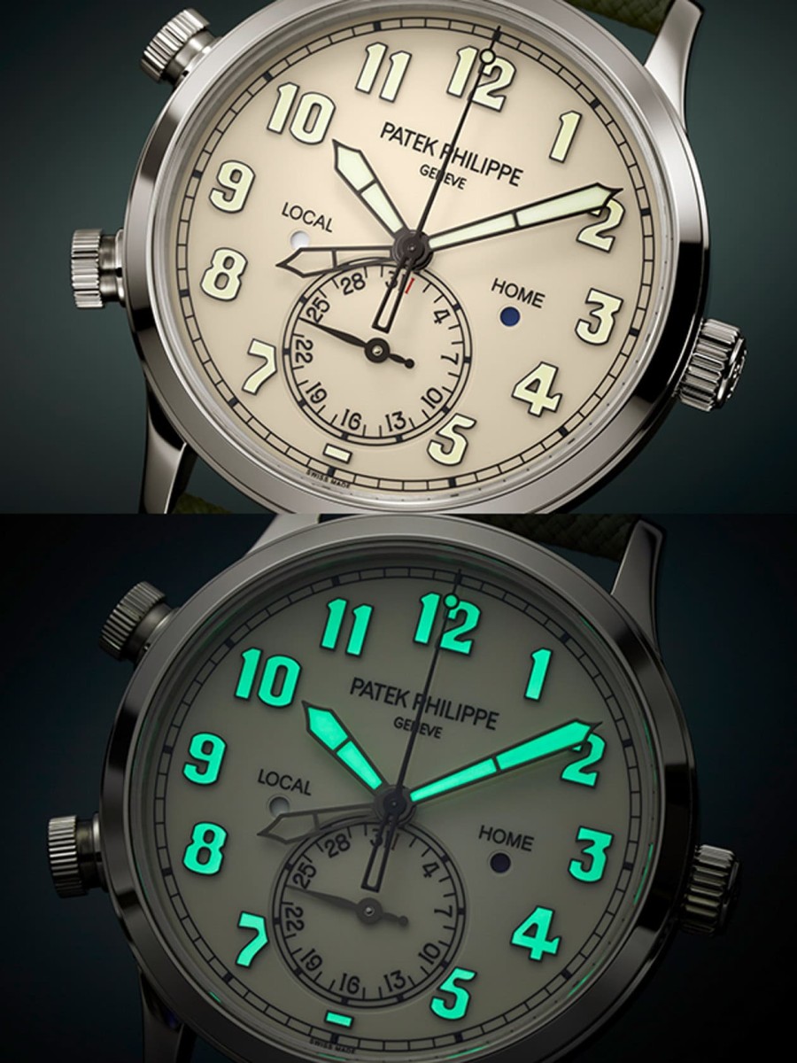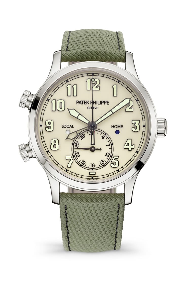 5524G-010最打动人的地方,在于它那种「看似不百达翡丽、却又很百达翡丽」的矛盾感。外观上,它继承了飞行表一贯的大尺寸、清晰数字与夜光涂层,功能直接、辨识性极佳,但与此同时,象牙色漆面面盘却柔和了军表的刚烈,使整体更接近复古优雅的氛围。黑化处理的白金阿拉伯数字时标,搭配炭灰色白金指针与浅黄色夜光涂层,形成低调又和谐的tone-on-tone(同色系搭配)效果,既实用又美观。此外卡其色复合材质表带与白金马鐙式表扣,巧妙致敬飞行员装备,这样的设计让它不仅是工具表,更像一个拥有故事感的收藏品。手表的表径42mm虽然略大,但厚度控制在10.78mm,佩戴起来比传统飞行表显得轻盈,展现百达翡丽在调校舒适度上的功力。简单来说它不是单纯做出飞行表的样子,而是把历史、实用与品牌风格混搭出一种新美学。