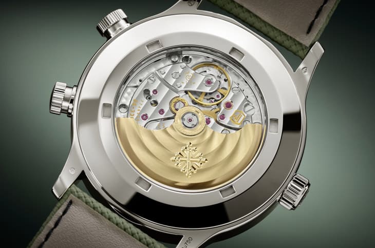 支撑5524G-010运作的是26-330 S C FUS自动机芯,这枚机芯在规格上已足够亮眼:4Hz震频、45小时动力储存、21K金自动盘、搭配Gyromax®摆轮与Spiromax®硅游丝。这些规格或技术不只是冰冷数据,而是实实在在地提升了走时稳定性与耐用性。再看机芯零件的修饰,这是典型的百达翡丽水准:倒角、日内瓦波纹、精致打磨,几乎到了「挑不出毛病」的地步,而且它还背靠百达翡丽印记,意味着每日-3~+2秒的精准度,以及从零件到组装的最高标准。换句话说,这枚机芯并不是单纯的工艺展示,而是真正结合了实用功能与顶级制表精神,能把一款工具导向的飞行表,搭配这样高规格的机芯,这就是百达翡丽与众不同的地方。