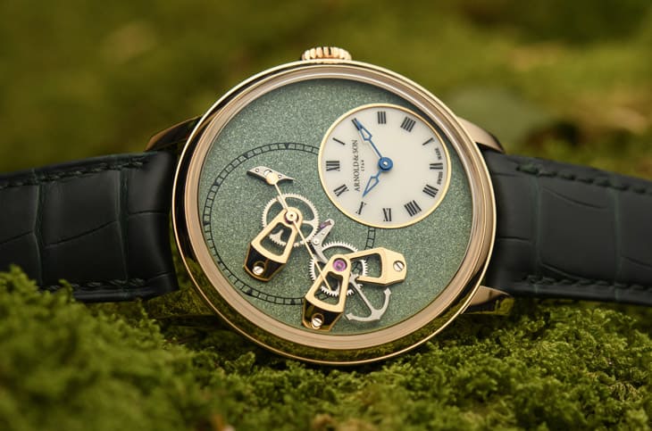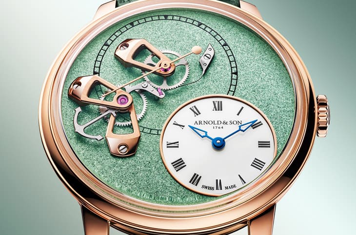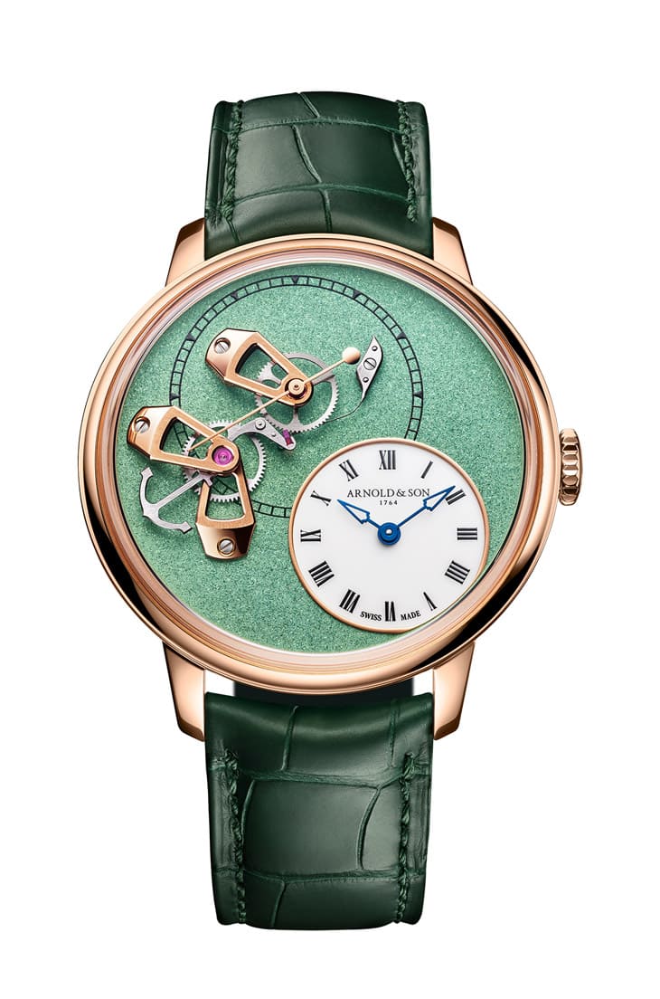 5N 18K玫瑰金材质/A&S6203自动上链机芯/偏心时、偏心分、跳秒显示/薄荷绿粒纹面盘、白色蛋白石小表盘/蓝宝石水晶镜面、透明底盖/防水30米/表径42mm/限量18只/参考价:NT$ 1,644,000
