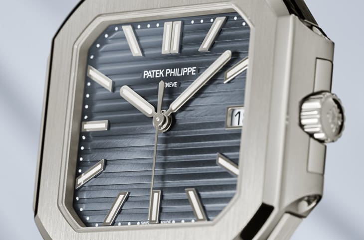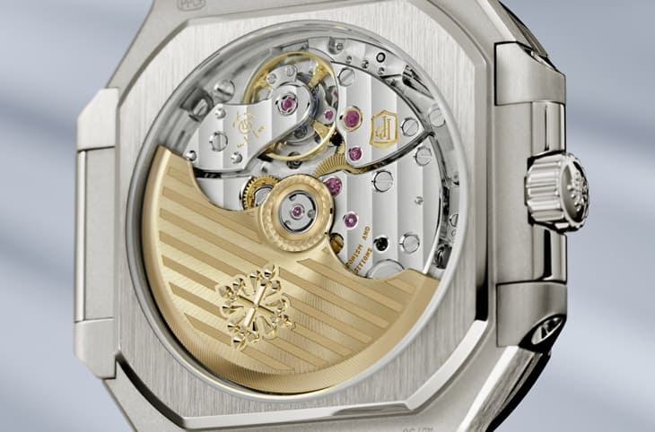 手表的蓝色太阳纹面盘在光线下会呈现不同层次,低调却耐看,和白金材质相映成趣,显得格外雅致。面盘的核心元素是水平压印纹理,这种设计无疑是向Nautilus致敬的线索之一,但Cubitus在处理上更乾净利落,没有过多装饰,反而让蓝面更显简洁。指针与时标方面,採用菱形指针与简洁的棒状刻度,读时一目了然,3点钟方向设有日期窗,尺寸适中、不抢戏,却保有实用性。不少收藏家认为蓝面是Cubitus最耐看的选项,比起玫瑰金的棕面更具当代气息,也更能突显「日常优雅运动表」的定位。更巧妙的是,机芯自动盘上的装饰同样呼应了面盘纹理,即条纹与太阳放射纹的组合,让正反两面都能感受到一致的设计逻辑,这种细腻的呼应,正是百达翡丽的功力所在。