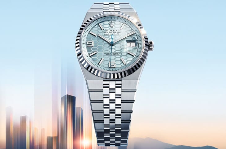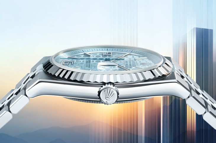 Land-Dweller 40mm给人的第一印象,就是质感沉稳又细腻,这款以铂金打造的蚝式表壳,厚度不到10mm,看数字可能觉得中规中矩,但上手之后却显得意外服贴,这得益于它的低重心设计,佩戴感甚至像38mm的表一样轻松自在。铂金表壳的处理手法也值得细看:表面经过细腻的磨砂,边缘与倒角则打磨得如同光影流转,呈现出高级金属专属的光泽感。表圈的三角坑纹比以往略宽,让经典的劳力士设计多了点现代感。另一个亮点是蓝宝石底盖,这是劳力士近年才逐步打开的「神祕面纱」,如今能清楚看到机芯的细节,对收藏家来说无疑是额外加分。劳力士此次为Land-Dweller 开发了全新的「纤薄纪念型」一体式金属表带。它源自1945年的纪念型五珠带设计,但结构重新调整:中央链节拋光并略为凸起,外侧链节则结合磨砂与拋光工艺,视觉上既有层次又不会显得浮夸,与表壳的整合度极高,几乎没有缝隙,看起来就像从表壳自然延伸出来。表带耳盖内藏陶瓷组件,用来提升耐用度并保护弹簧结构;隐蔽式摺叠皇冠扣则让整条表带显得更纯粹,佩戴时既舒适又充满质感,这种细致的调校正是劳力士能和顶尖品牌正面对话的底气。