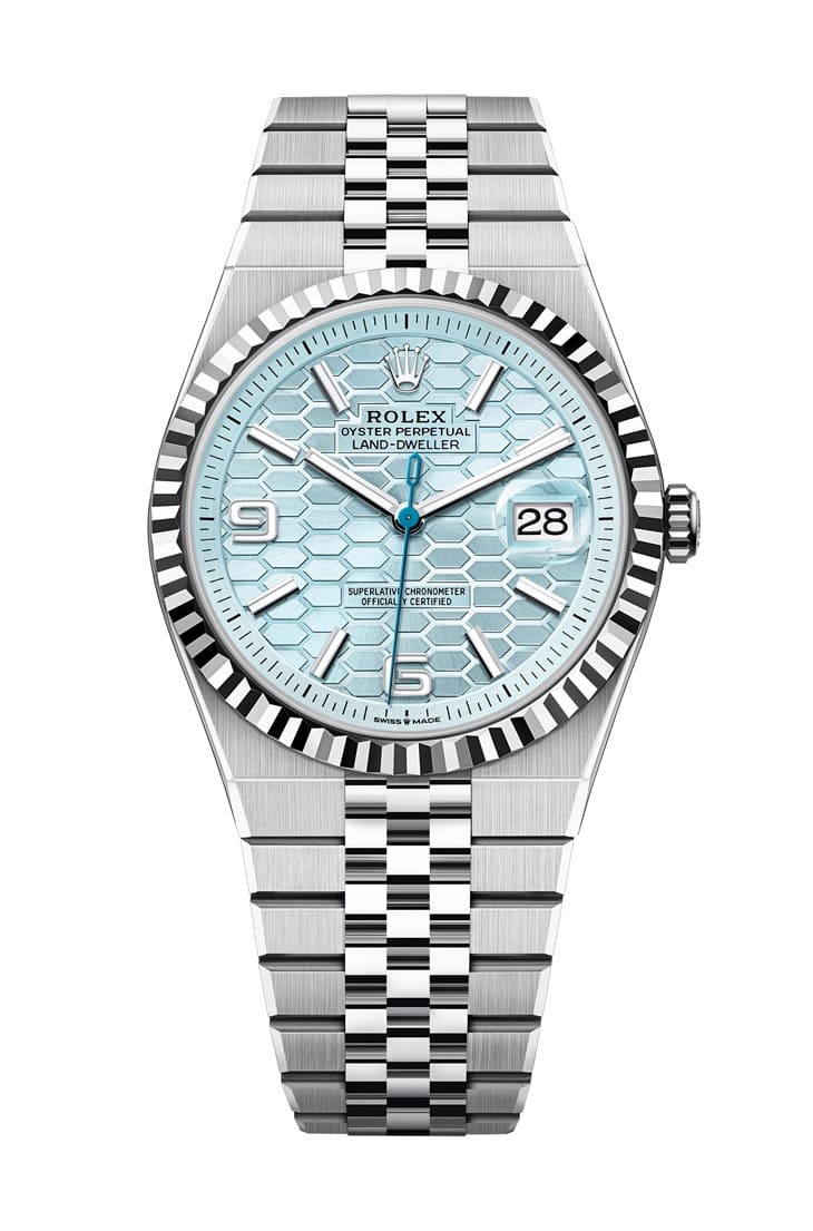 Land-Dweller铂金款採用劳力士专用在这种材质的冰蓝色面盘,对玩家而言辨识度极高。面盘表面带有放射状太阳纹,但更特别的是中央的蜂巢图案,劳力士运用飞秒雷射技术精密切割而成,蜂巢格边缘的细致坑纹在光线下会闪烁,让冰蓝色更显立体,配上镀蓝的秒针与蜂巢造型的平衡锤,视觉上充满科技感。时标设计则稍显大胆:6点与9点方向採用镂空数字,灵感来自Explorer与Air-King,这点争议比较大,有人觉得过于张扬,不如传统条状时标简洁,但也有人认为这正是Land-Dweller的个性宣言,无论喜好与否,它至少让这款表一眼就能辨认。所有时标与指针均覆以最新一代Chromalight夜光涂层,日间呈现统一色调,夜晚则持续发出均匀蓝光。面盘外圈的分钟刻度以冰蓝色凸缘印制,细致到半秒单位,带来精确又协调的视觉效果。