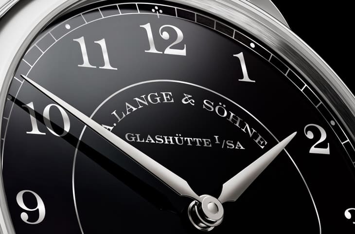 ▲黑色大明火珐琅面盘由朗格表厂全程制作,历经百餘道工序与多次焙烧,呈现光洁深邃质感,搭配阿拉伯数字时标与轨道式刻度,清晰而典雅。