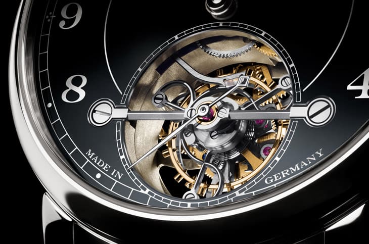 除了低调奢华外观,复杂功能也值得细细品味。这只新作的核心亮点,来自于6点钟方向的大型视窗,陀飞轮在其中旋转,除了是机械工艺的展演,也肩负着实际功能,众所周知,陀飞轮的设计初衷是对抗地心引力对摆轮系统的影响,确保手表走时更稳定。朗格进一步强化这项传统复杂功能,加入停秒装置与归零功能,当佩戴者拉出表冠时,陀飞轮会瞬间停下,小秒针同时跳回零位,分针也能精准对齐刻度。这让佩戴者在调校时间时,不仅能欣赏陀飞轮的结构之美,更能获得近乎绝对的走时精准。