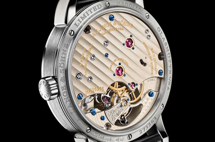 ▲手表搭载L102.1手上链机芯,具72小时动力与3Hz震频,机芯的3/4德国银夹板、黄金套筒与手工雕刻细节,彰显朗格一贯的工艺水准。