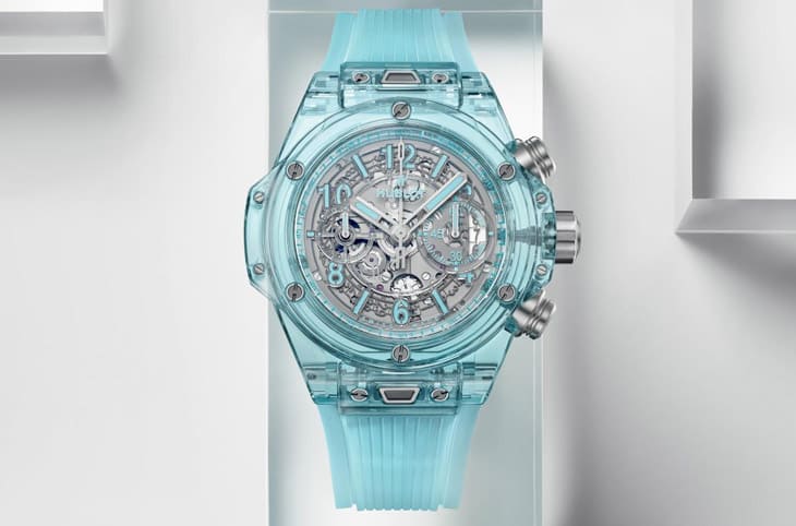 ▲宇舶Big Bang Unico湖水蓝宝石计时码表以蓝湖灵感打造通透梦幻表壳,搭载HUB1280机芯,融合材质创新与镂空美学,成就前卫杰作。