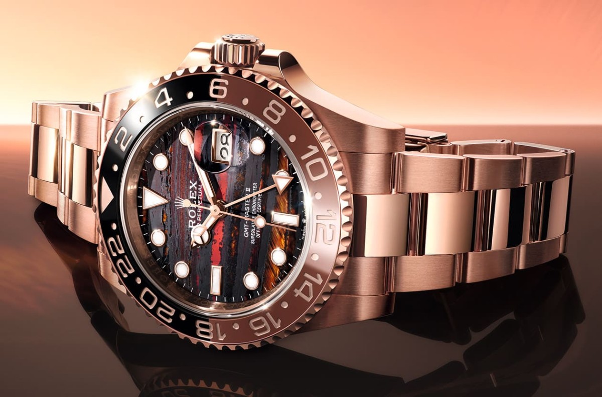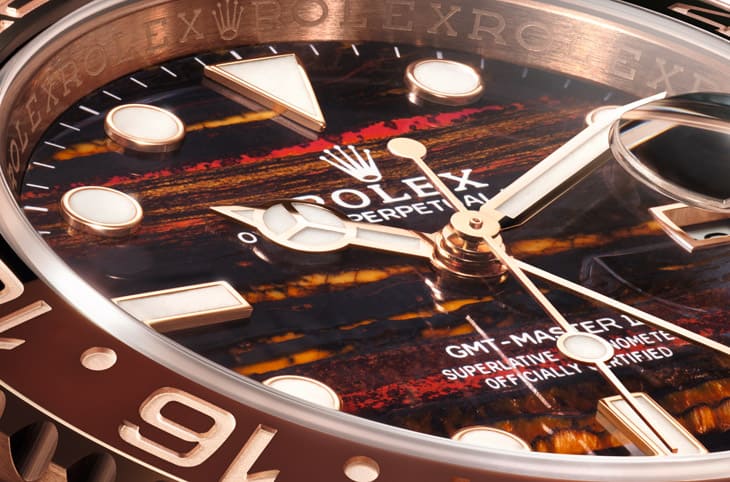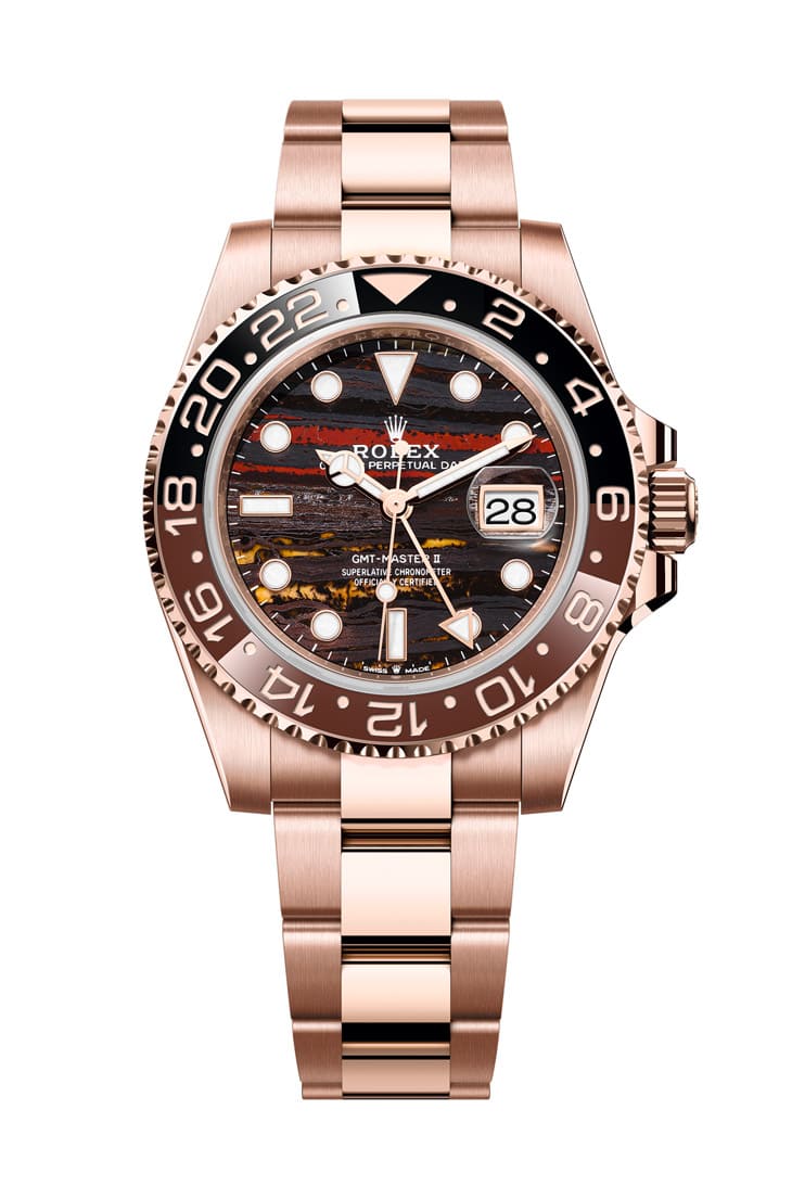 铁虎眼石是由虎眼石、红碧玉与赤铁矿交织而成,带来极其迷人的色彩流动感,表面呈现金棕色、红橘光泽与灰黑矿物纹理在光线下闪烁变幻,每一枚面盘都如同天然艺术品,没有任何两块会完全相同。传统上劳力士运动表的面盘大多採用黑色或单色系,而这次铁虎眼石的运用,等于打破了长久以来的惯例,它将大自然的原始力量直接带上手腕,与玫瑰金表壳相互呼应,形成一种既奢华又具异国情调的氛围。面盘上的时标与指针同样以永恒玫瑰金制作,并填入Chromalight夜光涂层,确保夜间仍清晰易读,3点钟方向的日期窗搭配经典小窗凸透镜,延续了GMT-Master II 的易读性传统,这种兼顾实用性与特殊性的设计,正是劳力士设计的独到之处。