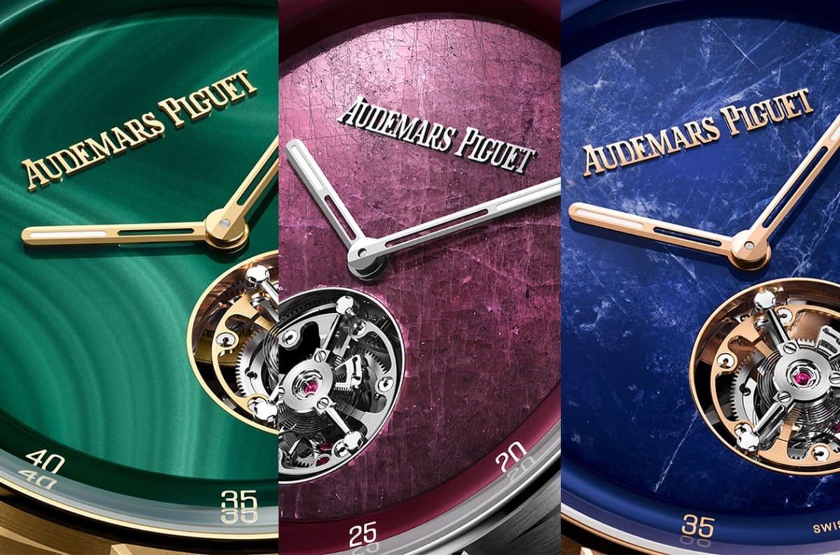首先看到18K黄金表壳与绿色孔雀石面盘的组合,孔雀石带有独特带状纹理与浓郁绿色,来自尚比亚,象徵成长与蜕变,第二款则採白金表壳搭配坦尚尼亚红宝石根面盘,鲜红色调象徵活力与守护,赋予手表强烈个性。最后一款为玫瑰金表壳,配以巴西蓝色方钠石面盘,深邃蓝色中点缀天然白色纹理,每一款都是独一无二。爱彼自1960年代起便开始探索天然宝石面盘的应用,工匠们往往需在薄如蝉翼的石材上保留其天然纹理与光泽,使每枚面盘都像微型艺术品般精致。