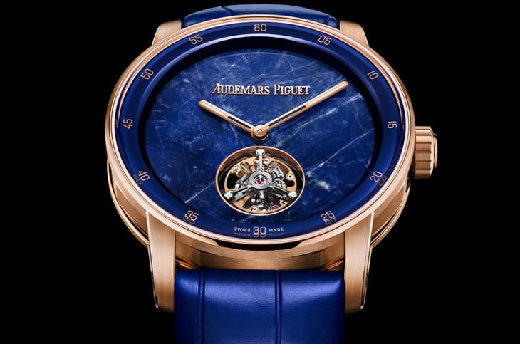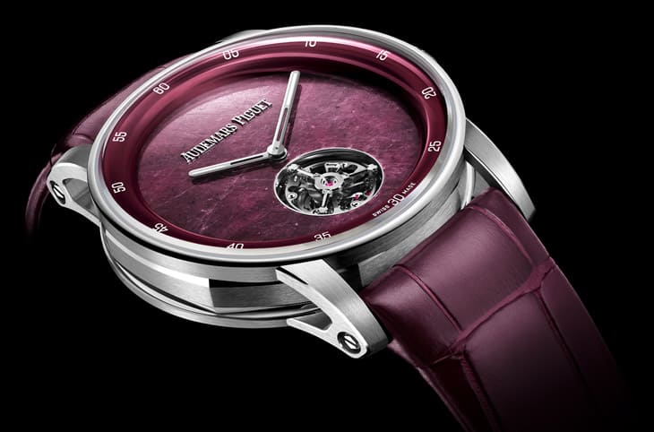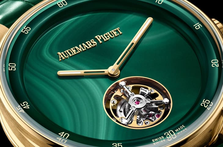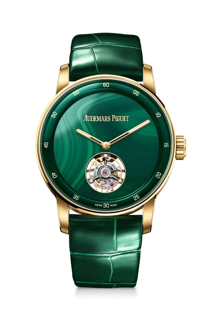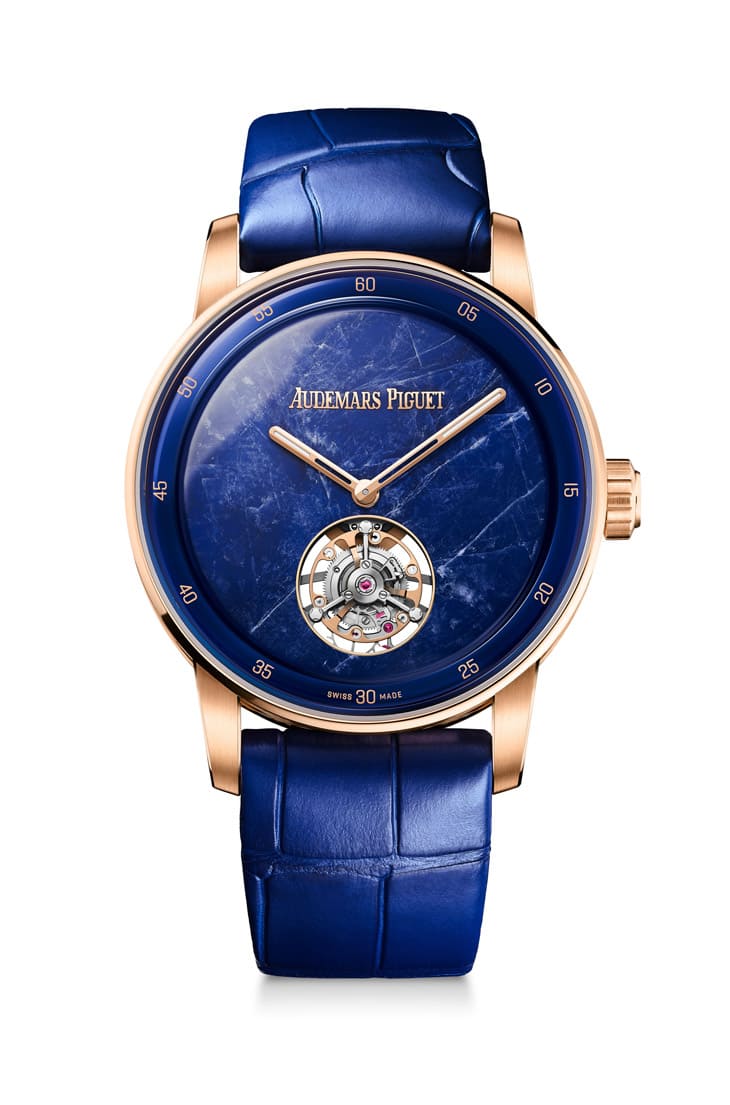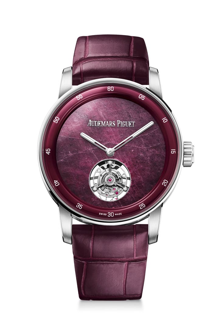 ▲爱彼将飞行陀飞轮与天然宝石面盘结合,体现微型化制表技术巔峰。每只时计皆具独特情感价值,展现个人风格与品牌精湛工艺,用以庆祝创立150周年里程碑。