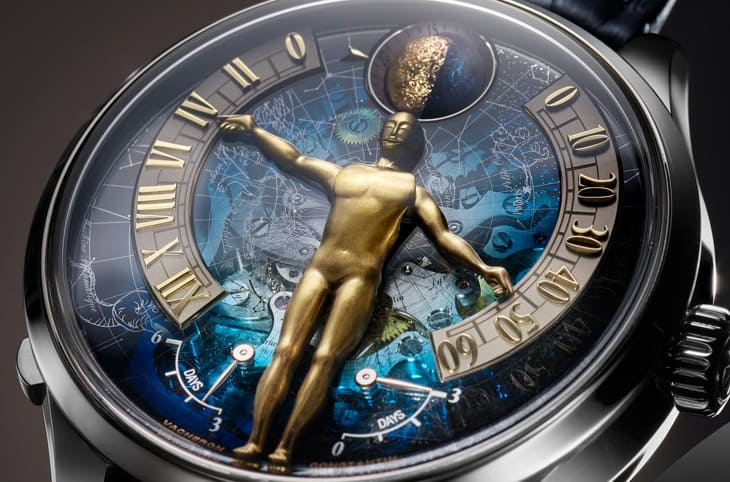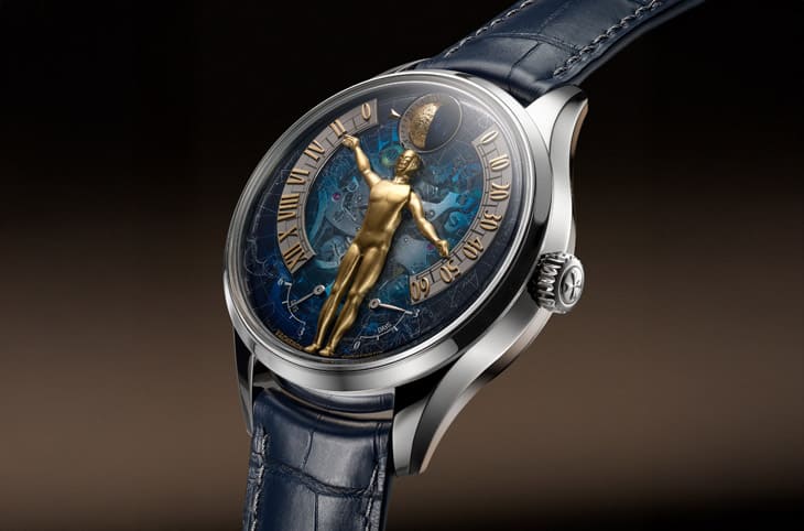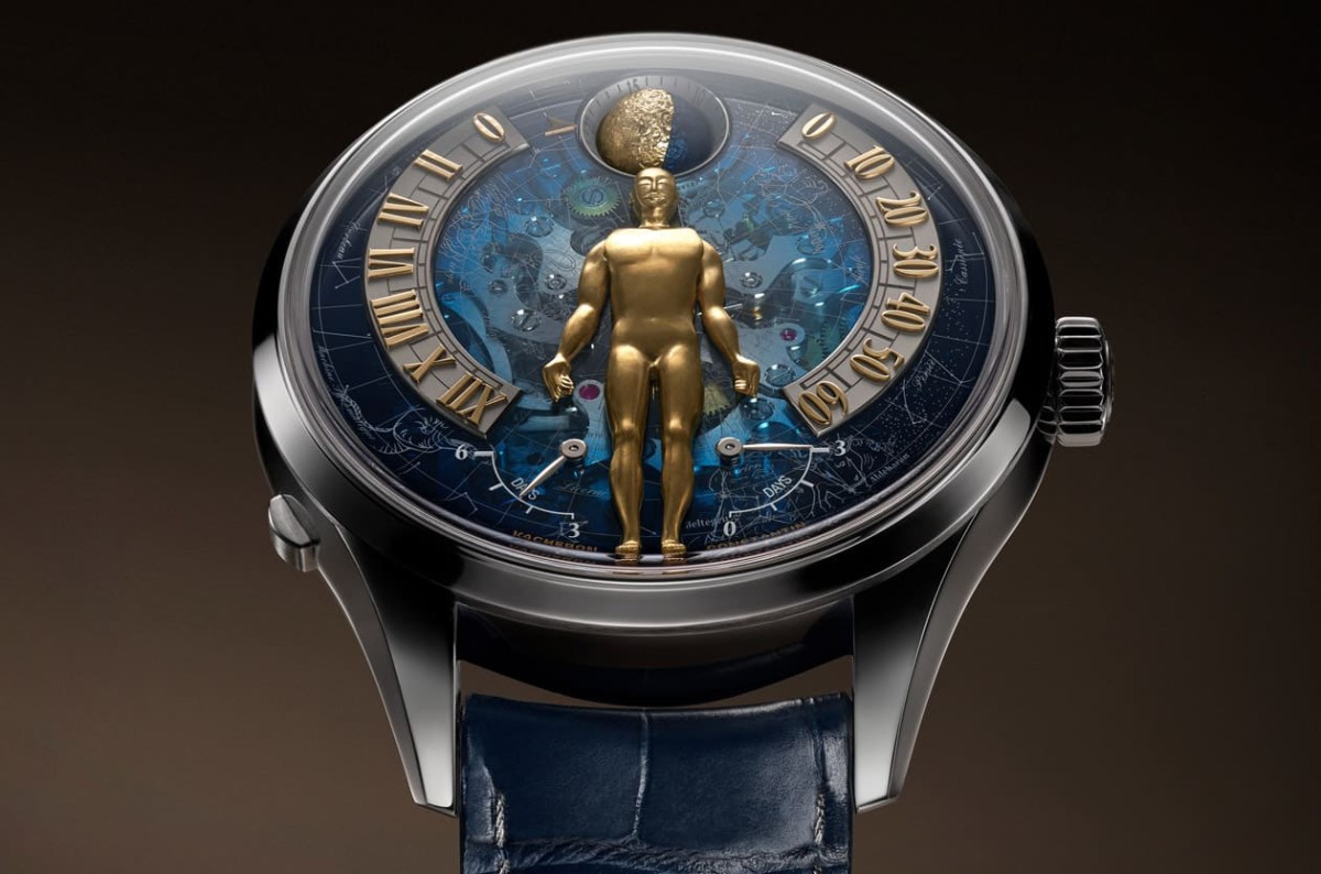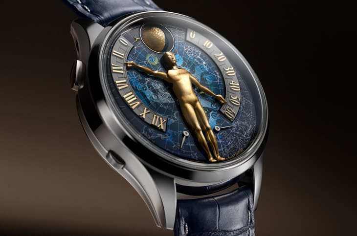 手表正面设计堪称一场舞台剧,核心是一尊经手工润饰的钛金属人偶,双臂分别化为小时与分钟的逆跳指针,右臂搭配罗马数字时标,左臂搭配阿拉伯数字分钟刻度,与深蓝色渐变双蓝宝石面盘相映成趣,眼尖的人会发现这尊人偶和面盘背景其实和江诗丹顿270周年的另一大献礼——La Quête du Temps顶级座钟有着一脉相承的设计概念,至于以人偶显时则是对1930年代魔术手怀表的致敬,但不同于历史作品,新作能在「持续显示」与「按需显示」间切换。
