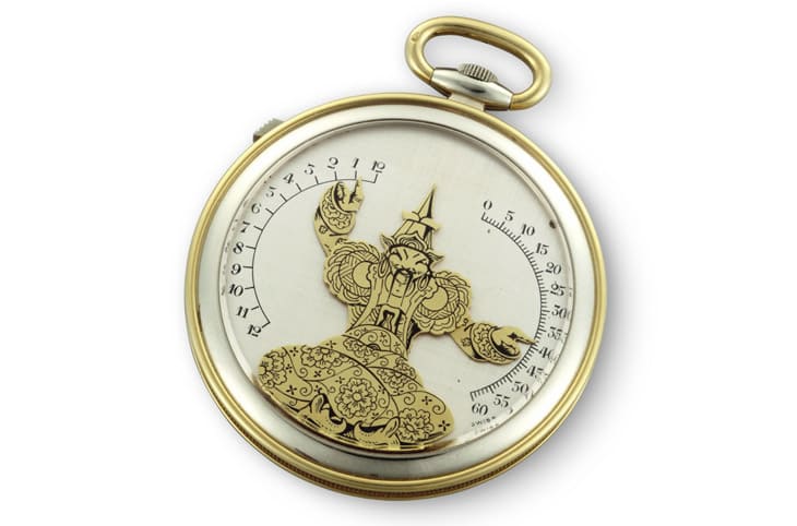 ▲用人偶双臂化为逆跳时分针的设计,源自1930年代「魔术手」怀表,此经典设计将时间显示与戏剧感结合,新作承袭并突破,延续江诗丹顿在逆跳显示上的历史创意。
