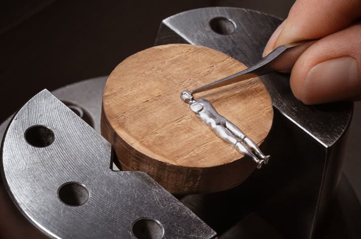 ▲人偶以钛金属制作并手工润饰,展现雕塑般质感。头顶立体月球以双色PVD诠释阴晴变化,外圈月龄刻度环以29.5天同步运行,赏心悦目且容易阅读。
