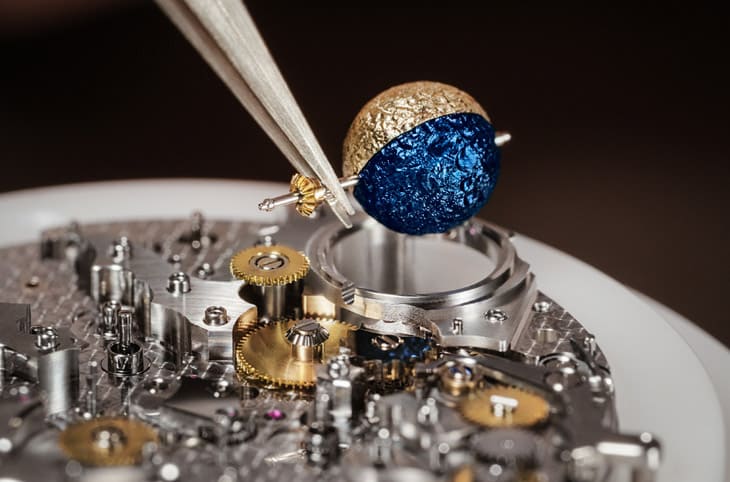 人偶背后的蓝宝石圆盘更是一大亮点,其上层描绘了1755年江诗丹顿创立当日的日内瓦星空,细节经过天文学家严格校正,精准无误,盘面顶端还悬浮着一枚立体月亮,由钛金属雕刻而成,一半镀上金色PVD,另一半覆以深蓝色,细腻呈现盈亏变化。月亮与外围刻度环以29.5天为周期旋转,并能随时调校而不影响走时精度,这也是江诗丹顿特别申请专利的技术,而面盘下方还有独特的两段式动力储存显示,直观呈现长达六日的能量状态,设计平衡且充满巧思。