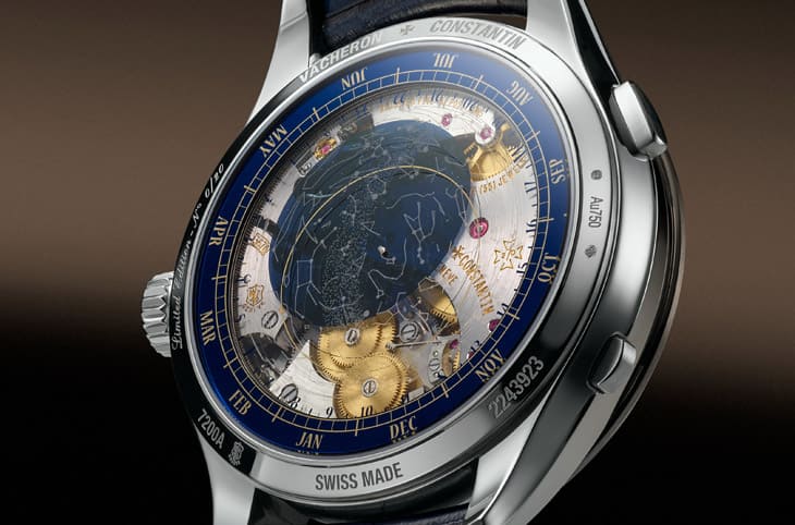 翻转表壳至背面,另一场天文盛宴立即展现眼前,蓝宝石底盖上以雷射雕刻与金属喷镀工艺制成的星空图,可即时追踪星座运行,精确度高达9,130年仅有一天误差,同时也能精准显示恆星日,透明底盖内还能见到机板桥上的「270周年」纪念标识,象徵着这款时计的历史地位。机芯装饰也经过特别考量,採用环形缎面拉丝处理,而非传统日内瓦波纹,目的在于减少蓝宝石底盖的反光,让佩戴者能清晰欣赏星空细节。