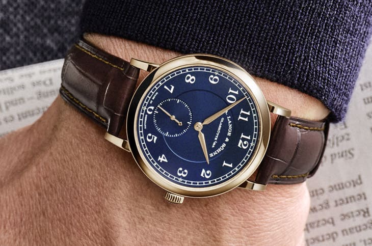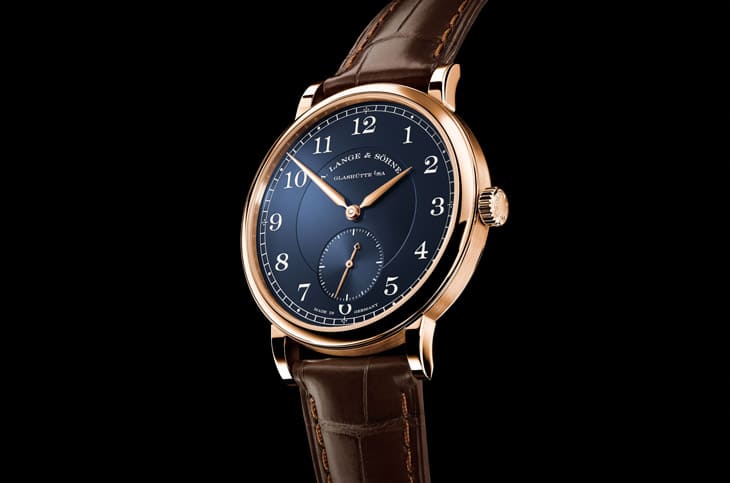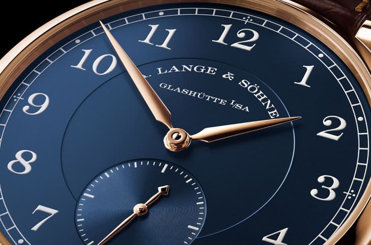 第一眼看过去,你会看到一枚蓝色调的面盘,它的基底其实是925银,经过电镀处理后呈现深邃的蓝色,这样的色调在朗格手表中并不常见,多半出现在特别款或限量版上,因此显得格外瞩目。面盘的结构灵感源自朗格早期怀表:中央略微凹陷,边缘则以细致的阶梯分层带来立体感,轨道式分钟刻度环绕外圈,这是1815系列最鲜明的符号,让人一眼就很容易辨认,时标选用阿拉伯数字,字体厚实而带衬线,既经典又多了几分休閒味道。6点钟方向的小秒盘则是亮点之一,它以蜗形纹装饰,低调却能在光线下呈现细腻变化,同时还具备玫瑰金质感点缀,呼应外壳材质。至于指针,则是1815家族的招牌——叶形(Lancet)设计,修长的分针能精准触及刻度边缘,让读时一目了然,可以说面盘设计没有多餘装饰,但却能在简约中流露层次,这就是朗格的拿手好戏。