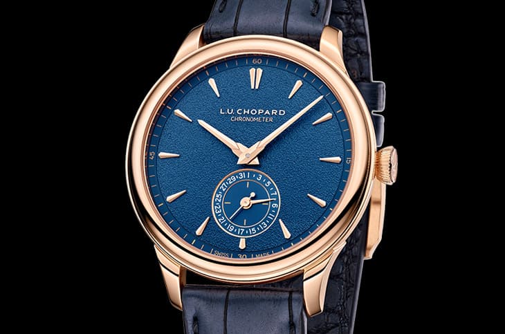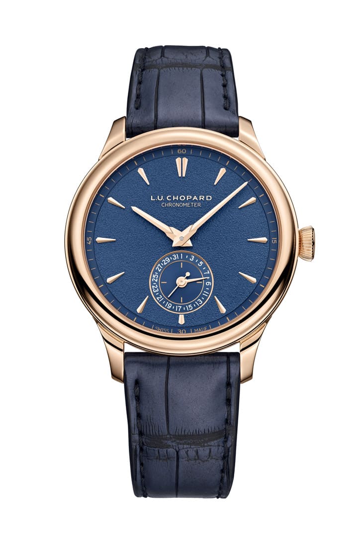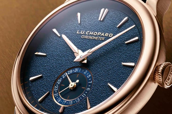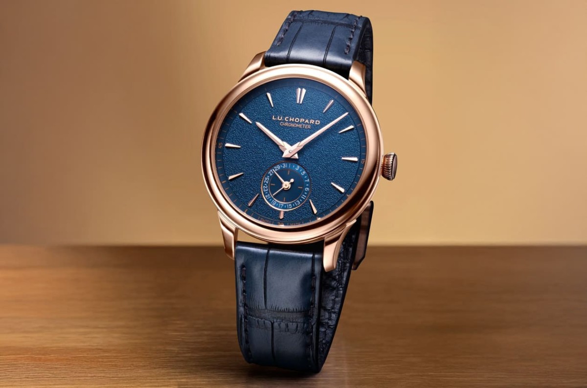 面盘可说是这款25周年纪念版最令人眼前一亮的地方,萧邦选择了电镀深蓝色的黄铜材质,并施以雾面粒纹处理,让蓝色看起来不浮夸,反而呈现深邃与沉稳,当玫瑰金指针与时标映照其上时,对比效果极为鲜明,既优雅又富现代感;与过往版本相比,这次在设计上做了大幅度的简化,动力储备显示被移除出面盘,转而安置在机芯背面,这一巧思使得整体视觉更纯粹,并将焦点集中在时间本身,6点钟方向的下陷小表盘,则同时兼具小秒针与指针式日期显示功能,这个设计不仅实用,其装饰细节也相当讲究:中央蜗形纹搭配外圈拉丝处理,中间以倒角分隔,细腻而立体。L.U.C Quattro手表的面盘设计,正好展现了「少即是多」的哲学,它不追求满版的复杂感,而是以极简线条与精致细节达到高级感,将蓝与金的组合,转化为雋永的视觉体验。