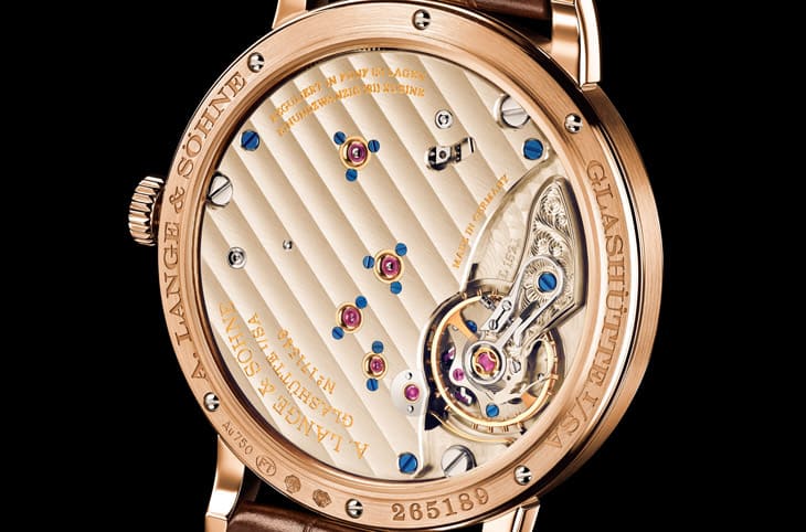 ▲34mm玫瑰金表壳厚度仅6.4mm,拋光与缎面交错修饰展现优雅比例,层次分明设计承袭朗格低调朴实风格。