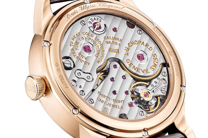 18K玫瑰金材质/L.U.C 98.09-L手动上链机芯/时、分、小秒、日期显示/蓝宝石水晶镜面、透明底盖/防水30米/表径39mm