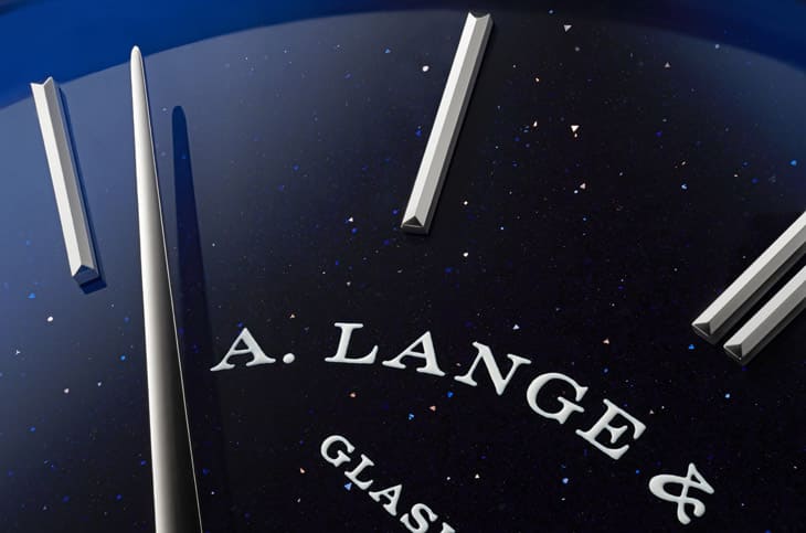 ▲砂金石由于含铜微粒因此于光影下闪烁如星光,朗格融合实心银面盘,营造梦幻夜空般的独特视觉魅力。