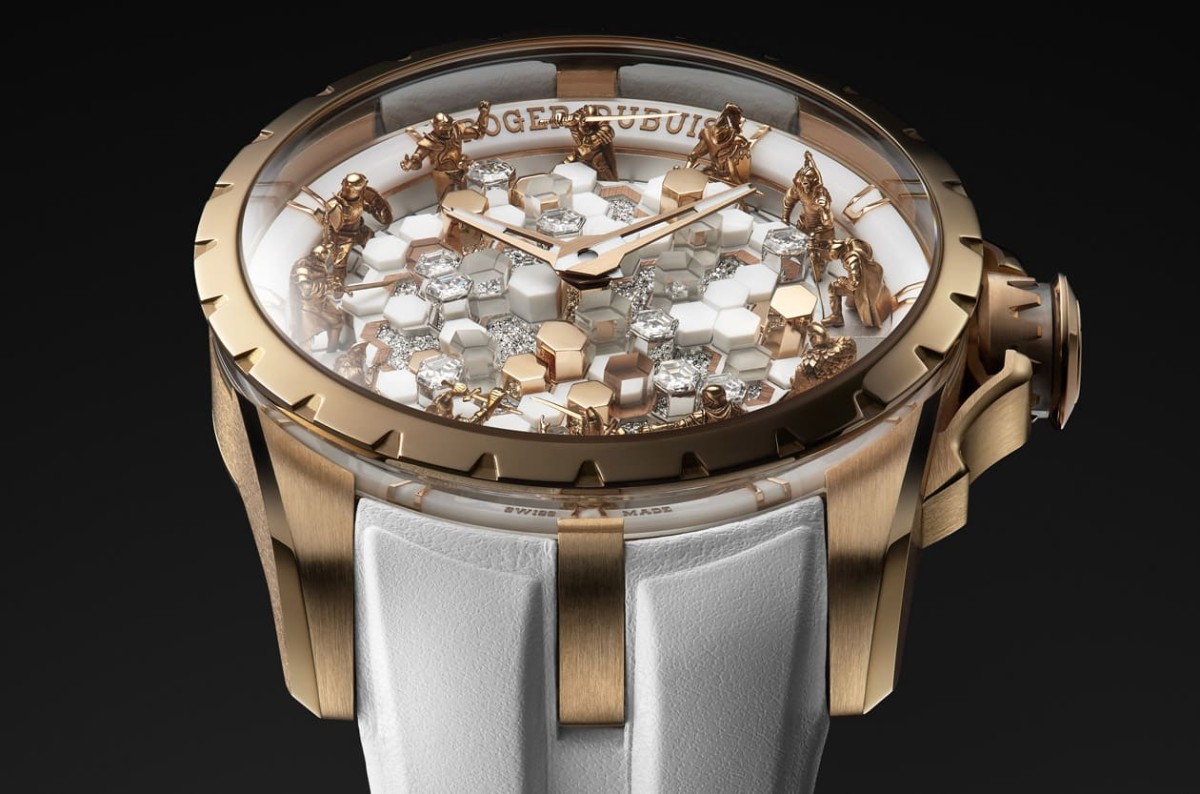 ROGER DUBUIS 2025年新推出的Excalibur Knights of the Round Table–The Enchanter Merlin手表,再次把亚瑟王传说搬上面盘,这回的主角是梅林与湖中女神的故事,罗杰杜彼透过繁复材质和极致工艺,建构出一个如幻似真的水晶宫殿,将传奇化为腕间可见的立体奇景。