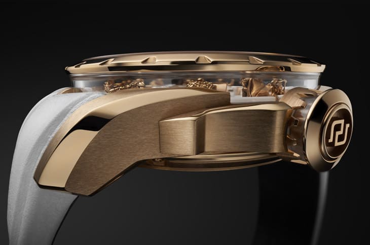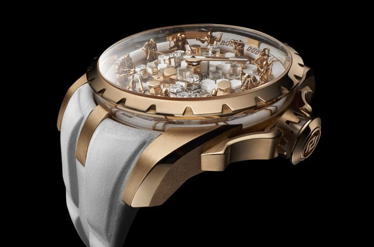 ▲玫瑰金表壳在表圈下方设置蓝宝石环,形成侧面视窗,这巧思让佩戴者能从多角度观赏12位骑士与水晶立柱交错而成的戏剧化光影。