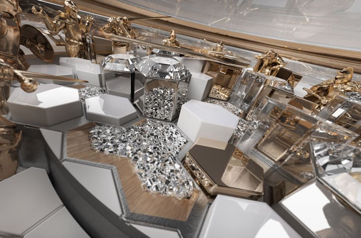 ▲9枚镀金立柱顶端首次镶嵌六角切割钻石,採用隐形镶嵌技术,使宝石宛如漂浮于空中,这种无缝效果精妙呼应水晶宫的幻影氛围,极具观赏震撼。