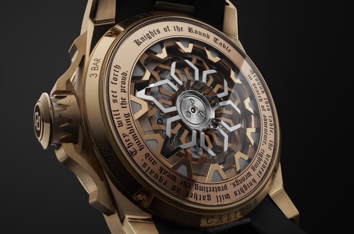 承载这场传奇舞台的是45mm的Excalibur表壳,玫瑰金材质经拉丝与拋光处理,呈现鲜明对比,经典的凹槽表圈、三岔式表耳与剑柄造型表冠等,皆呼应亚瑟王圣剑的设计脉络。手表防水深度30米,实用之餘仍不失华丽,翻至表背,蓝宝石底盖展示机芯运行,底盖边缘鐫刻系列自2013年以来启用的亚瑟王名言,彰显骑士间平等与勇气的精神。