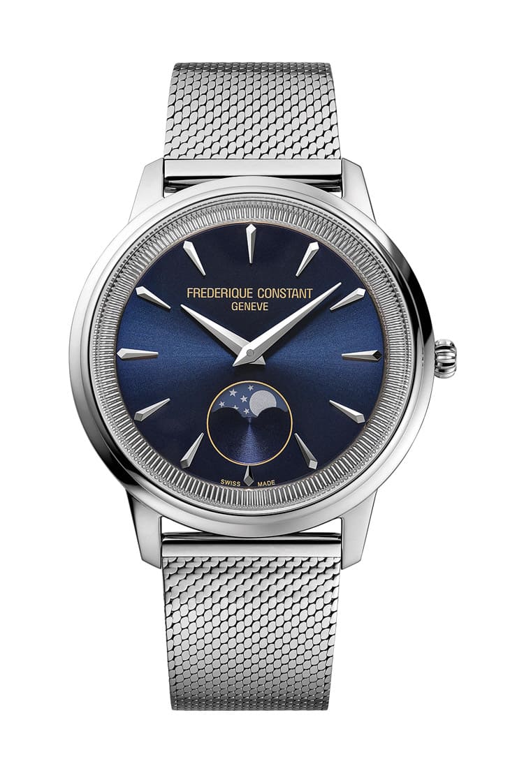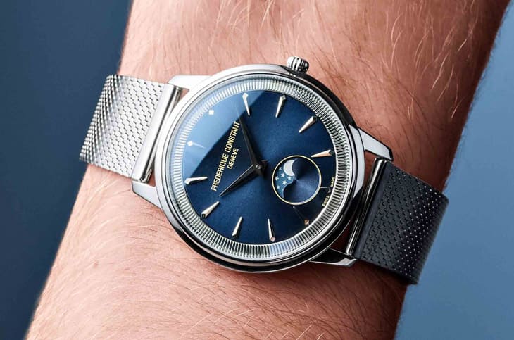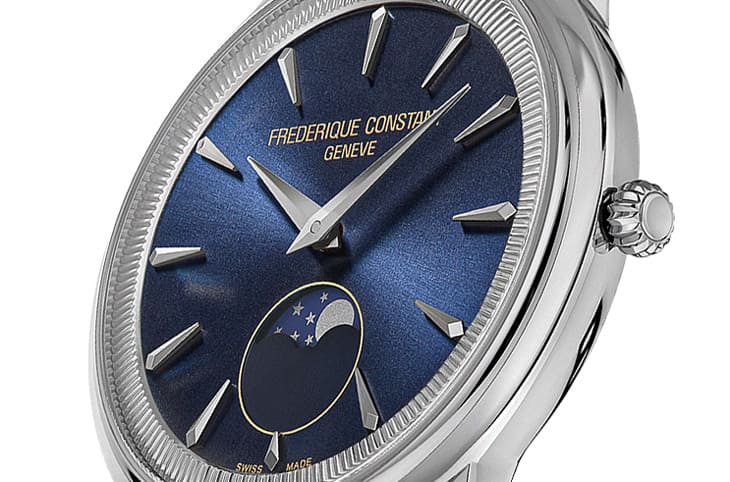 内部搭载的FC-206石英机芯提供长达60个月的自主运行时间,除非电池耗尽或转换时区,几乎无需日常调校,虽然石英机芯可能让部分收藏家感受不到传统手表的价值光环,但面盘细节展现品牌用心,例如手工拋光的指针、多切面时标,以及增添层次的钱币纹设计,均表现出高水准的工艺感,加上这个系列以亲民价格呈现出一款易用且美感出众的月相表,别具日常佩戴吸引力。