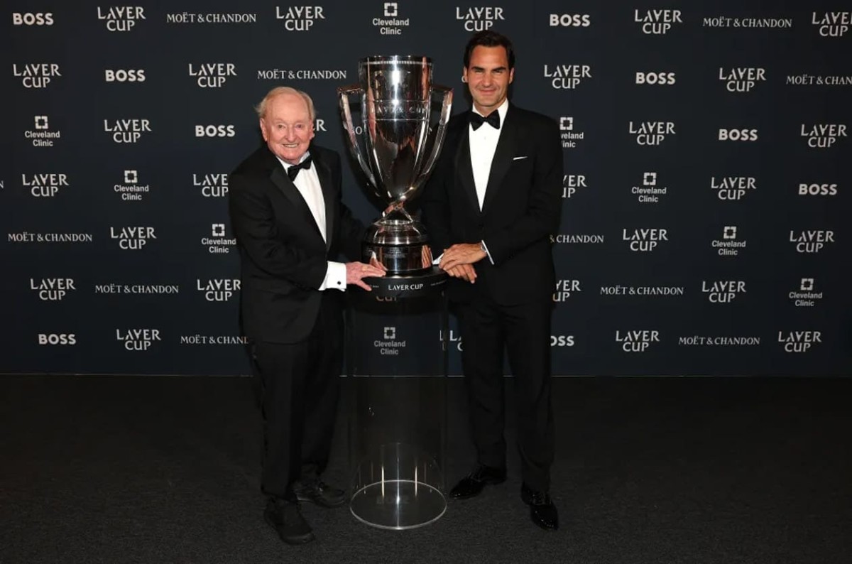 ▲费德勒现身由他共同创办的拉沃杯,与另一位网坛传奇Rod Laver合影奖杯,场边瞬间成为焦点,突显他作为赛事精神象徵的地位与荣耀。Source:World Tennis Magazine