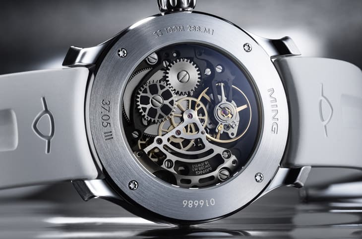 不锈钢材质/MING 288.M1手动上链机芯/时、分、日期显示/月相显示/蓝宝石水晶镜面、透明底盖/防水100米/表径38mm/限量100只/参考价:NT$ 222,000