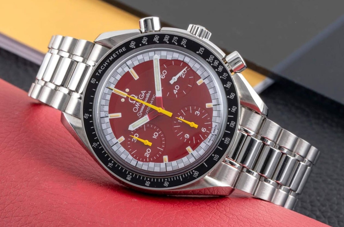 要说超霸Reduced系列中最具代表性的变体,绝对非「舒马克配色」莫属。1996年,欧米茄与一代车神麦可.舒马克(Michael Schumacher)合作,推出了三款鲜艳的彩色版本:红色3510.61、黄色3510.12,以及蓝色 3510.81。这些设计分别对应他效力过的FERRARI、JORDAN与BENETTON车队。与传统超霸的黑白设计不同,舒马克版本展现出截然不同的氛围,面盘採用鲜明的单色,搭配赛车旗元素的刻度圈,并可选择与面盘同色的皮表带,将赛车文化直接搬到手腕上,甚至连表盒也特别设计成赛车轮胎造型,让收藏过程充满趣味,这款作品犹如1990年代怀旧文化的缩影,今天回看,它们依旧是「玩味」超霸的经典代表。