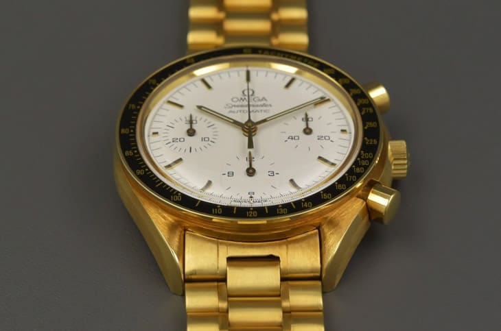 若双色金还不够,那麼全金款的Speedmaster Reduced就是彻底的华丽「升级」版本。同样以175.00.03为基础,这些全金型号採用18K黄金打造,重量十足,虽然表径依旧是39mm,但戴在手上却有着与专业款截然不同的存在感;更特别的是,它搭载了白色面盘,并饰以同心圆纹的金色小表盘与金质指针,展现出高端计时码表的另一种样貌,这个版本明确表达了欧米茄的野心:Reduced不只是入门选择,也能是一只彻底的奢华时计。