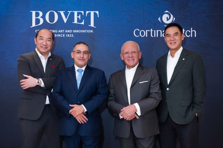 ▲左起为高登钟表台湾董事总经理陈汉林、BOVET营运副总Jamel El Fettouhi、BOVET主理人Pascal Raffy、高登钟表执行长林日耀。