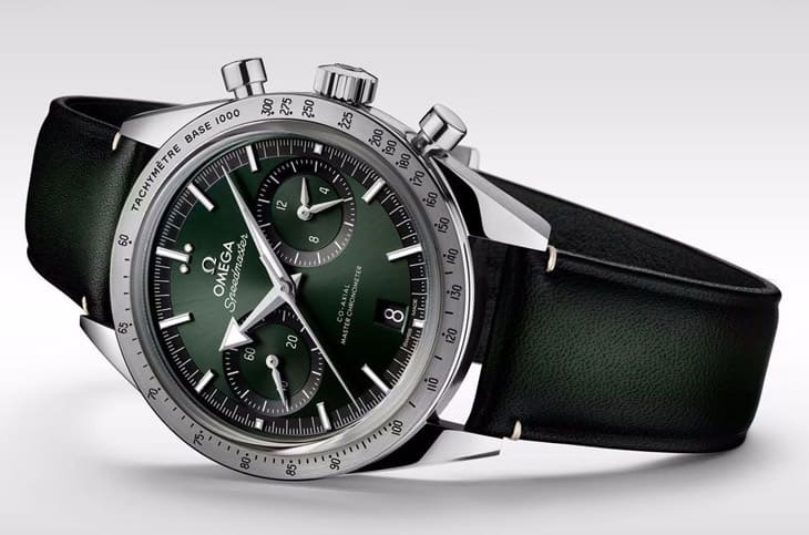 ▲超霸'57延续1957年经典设计,40.5mm不锈钢壳搭配绿色太阳纹面盘与皮表带。Source:Instagram @mjfceo
