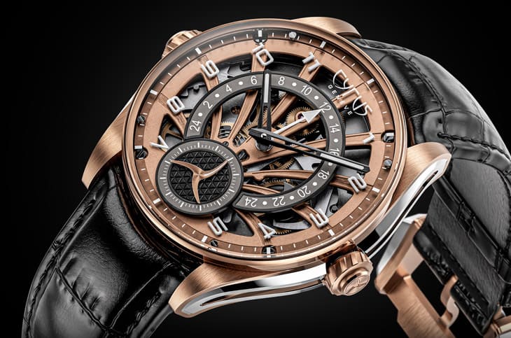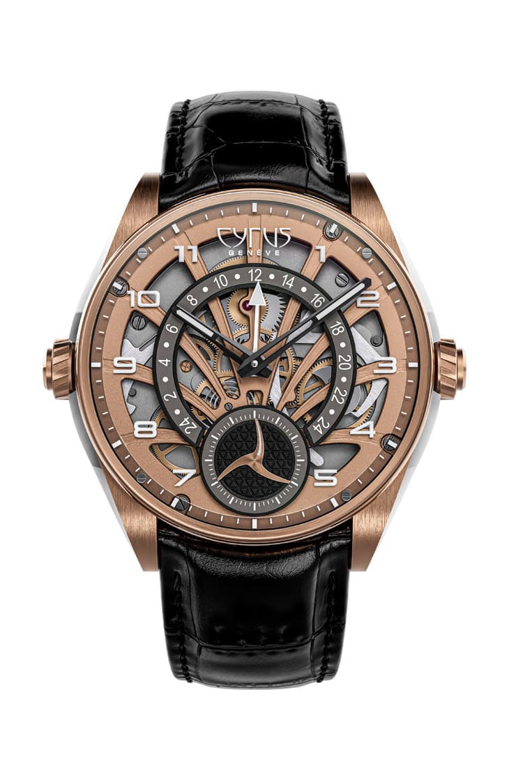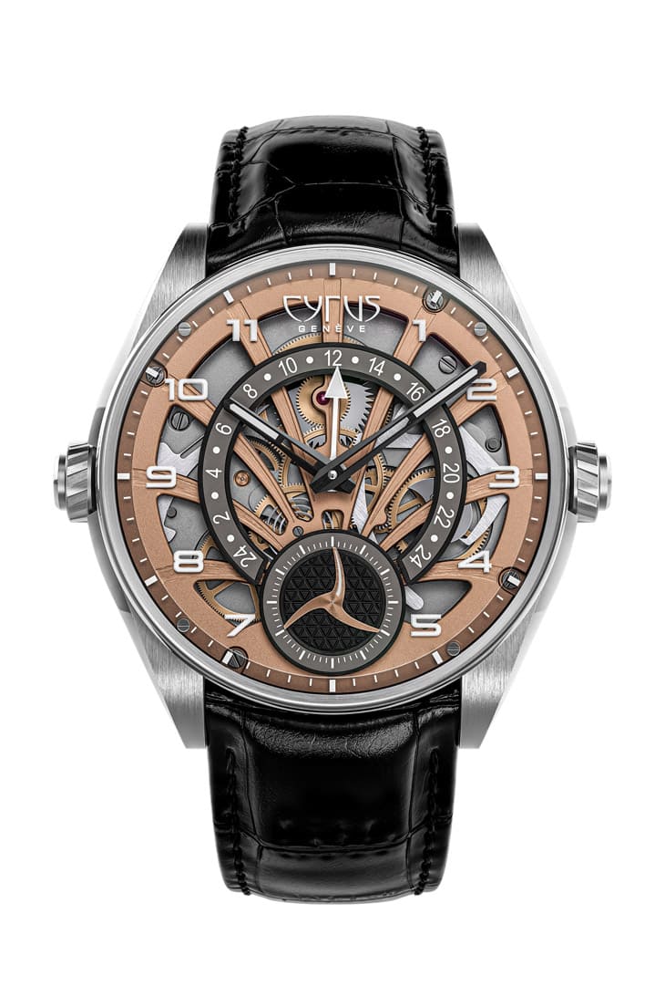 Dominion GMT的面盘设计层次丰富,中央镂空时分指针显示所在地时间,第二地时间透过逆跳指针搭配24小时弧形刻度呈现,面盘上层的机芯桥板灵感源自棕櫚树造型,採用玫瑰金色系镀层,横跨面盘如雕塑般展示逆跳系统与齿轮运作。手表搭载CYR708制自动上链机芯,由278枚零件组成,靠着单一发条盒提供55小时动力储存,震频4Hz,蓝宝石底盖展现经NAC(黑銠)处理的桥板,结合弧形太阳放射纹、雾面喷砂及拉丝交错修饰,每个细节都清晰可见。
