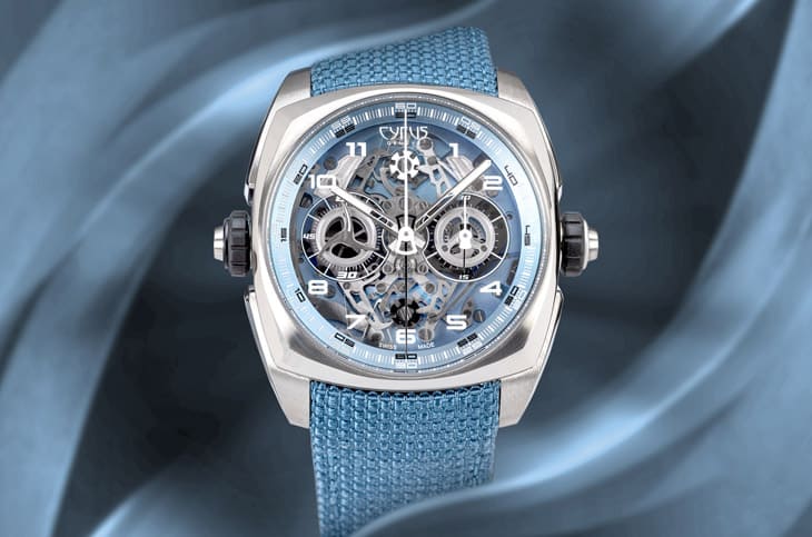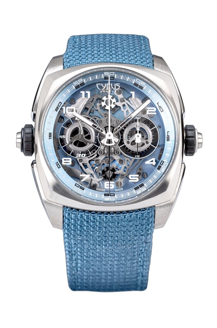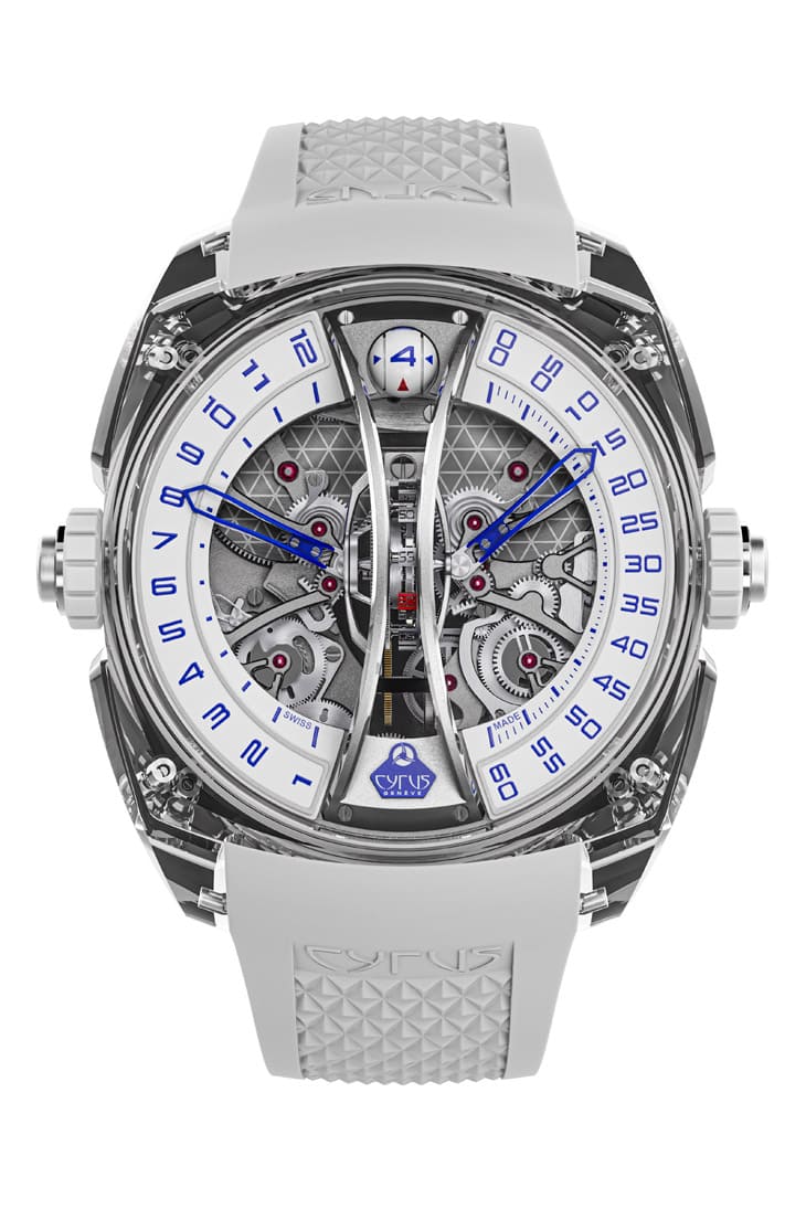 CYRUS的顶级制表代表作,还包括Klepcys Vertical Tourbillon Sapphire Blue垂直镂空蓝宝石陀飞轮,全球仅8只,蓝宝石水晶表壳结合18K白金细节与电光蓝色,呈现未来感氛围,延续Klepcys系列枕形表壳,採用莫氏硬度9级蓝宝石水晶,制作超过150小时,光影间呈现雕塑般立体效果。