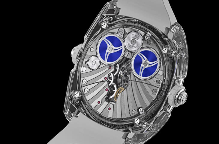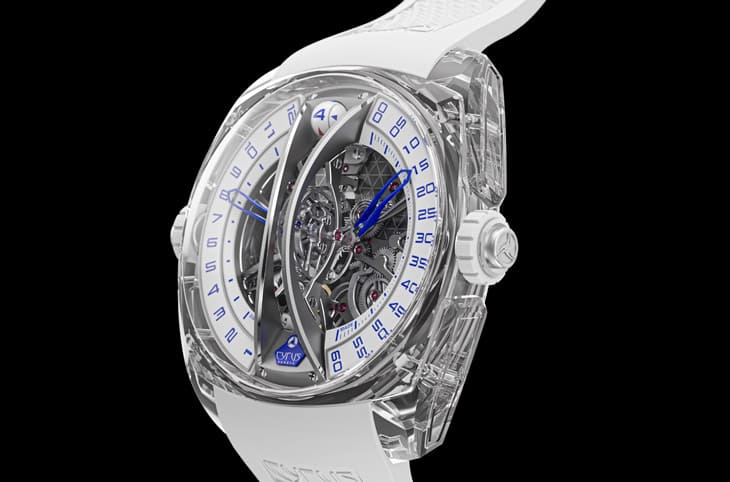 蓝宝石材质/CYR625手动上链机芯/逆跳时、逆跳分、秒显示/陀飞轮装置/动力储存显示/蓝宝石水晶镜面、透明底盖/防水30米/表径44mm/限量8只/参考价:NT$ 10,580,000