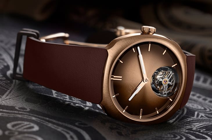 ▲採用Gasly指定的巧克力烟燻色面盘,棕色渐层深邃细腻,玫瑰金时标与透明标志营造内敛奢华气质。