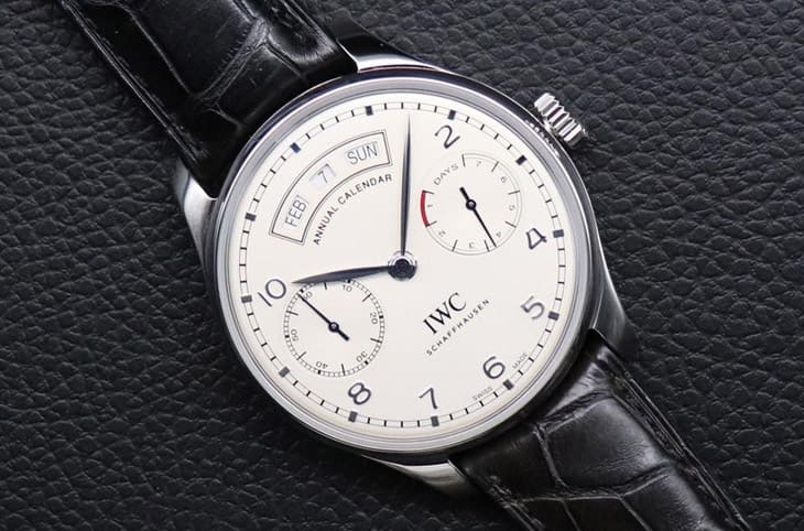 ▲葡萄牙年历表具7日动力与三窗式显示,设计典雅实用,体现IWC对时间的精密掌控。Source:Chrono24